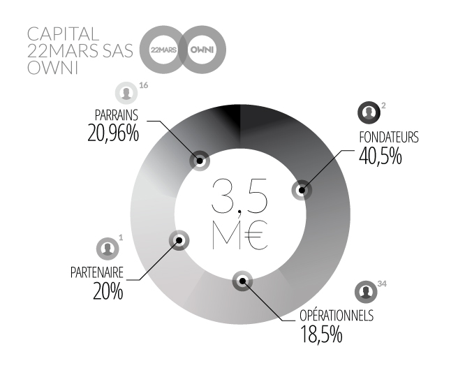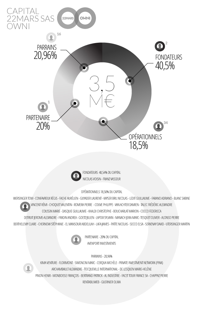 Après cette opération, les « co-fondateurs » (Nicolas Voisin, Franz Vasseur) détiennent 40,54% du capital de 22Mars SAS, maison mère d’OWNI et d’OWNI Inc. En parallèle, nous avons pu associer ceux des salariés d’OWNI qui ne l’étaient pas encore : les près de 35 « opérationnels » (dont 28 salariés) sont associés et détiennent 18,50% du capital. Ainsi, près de 60% des actions de la société, dorénavant valorisée 3,5 M€ à l’issue de ce tour de table, sont détenus par ceux dont la sueur et le jus de cerveau ont permis de bâtir notre navire amiral, La Soucoupe.