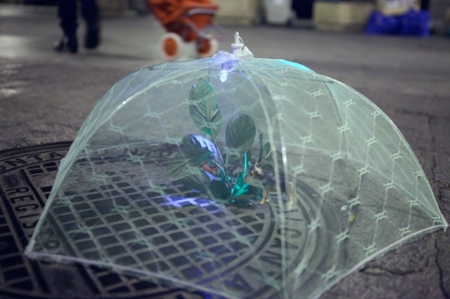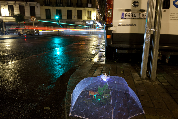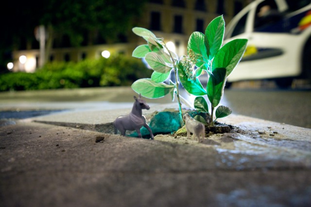 Nous déplorons le manque d’espaces verts à Madrid, et nous avons décidé pour cette raison de partir à la recherche de ces petites plantes qui poussent timidement dans les endroits les plus inattendus. Nous voulions de manière symbolique les protéger et les préserver, ce que nous avons fait avec des petites serres portables pour les abriter de la pollution, et un troupeau d’animaux pour les accompagner.