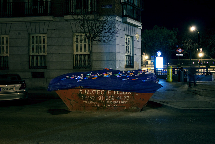 Les containers de gravas des rues de Madrid sont comme des bateaux échoués entre les voitures, en attente de la marée qui ne viendra jamais les emporter vers le large.