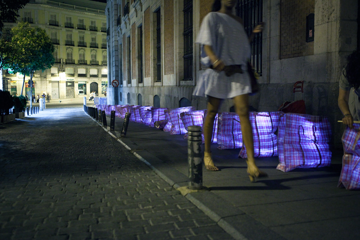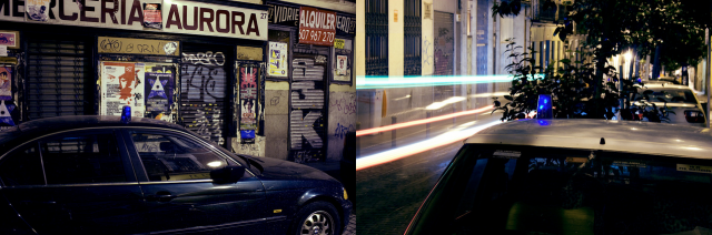 La police est partout ? Qu’à cela ne tienne, ils collent, en l’espace de quelques heures, de faux gyrophares fabriqués avec des verres en plastique, de la cellophane bleue et des lumières intermittentes, sur tous les toits des voitures d’une place du quartier de Malasaña. Le nom de l’installation? Tant de police, pour si peu de gens…
