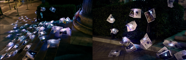 C’est dans ce contexte que nous vous faisons découvrir le collectif espagnol d’artistes street-art, Luz Interruptus, qui avait créée littéralement, un envol de 80 doubles pages des sections économiques des grands quotidiens nationaux, illuminées, sur les marches du palais de la Bourse de Madrid en pleine crise financière en 2009: le vent nous amène la crise.