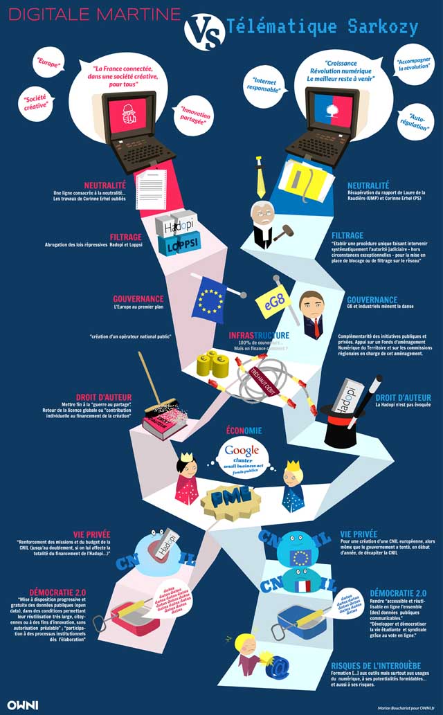 ”Je ne suis pas née dedans, je vous avoue que je suis dépassée par la situation sur ce terrain là”, admet d’ailleurs Martine Aubry au détour de la conversation. Une attitude peu geekfriendly qui risque de lui jouer des tours face à une majorité qui mise son va-tout sur le numérique, dans un programme savamment intitulé ”Révolution numérique, le meilleur reste à venir”. L’UMP tente de se ressaisir sur Internet, poussée par un Nicolas Sarkozy qui semble avoir compris que le réseau et ses flambants industriels constituent une belle manne financière. Résultat: on abandonne l’“Internet civilisé” et autres bullshits du genre pour mettre les bouchées doubles sur les propositions 2012. Tant et si bien que les différences entre l’UMP et le PS sur le numérique paraissent bien tenues (voir notre comparatif illustré: Digitale Martine vs Télématique Sarkozy)