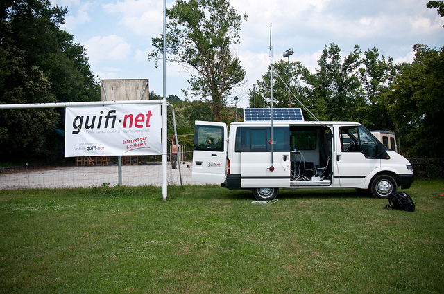 Juillet 2011. Sur un terrain de football perdu au milieu des volcans pyrénéens la Guifineta profite du soleil pour se recharger. Cette petite camionnette de l’association Guifi.net, équipée d’un panneau solaire, d’antennes WiFi, de petits routeurs et autres câbles, parcourt les routes de Catalogne pour connecter les nouveaux utilisateurs d’une des plus grande communautés WiFi en Europe.
