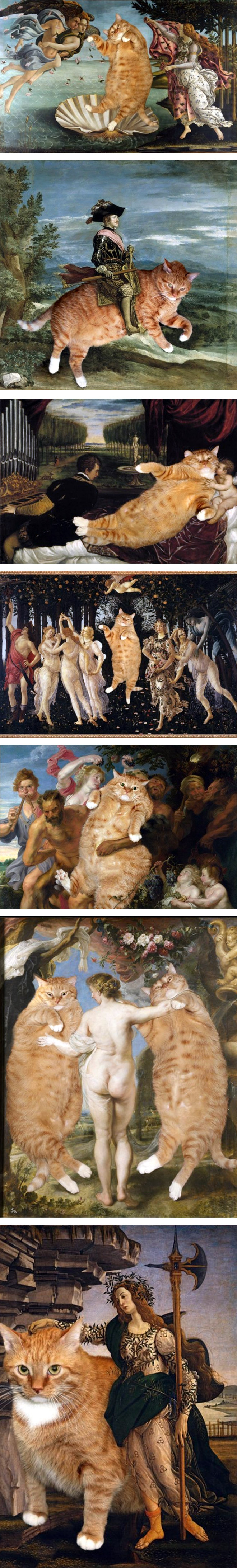 Bon, le WTF de cette semaine est très très “lourd”. Sur un forum japonais, une série d’images a été publiée, il s’agit en fait de reprises de tableaux et notamment de la peinture classique italienne … mais revisités avec de gros chats ! À cette époque, les femmes en chair étaient le modèle absolu en peinture. Aujourd’hui ce sont de gros chats… Décidément les temps changent ;-)