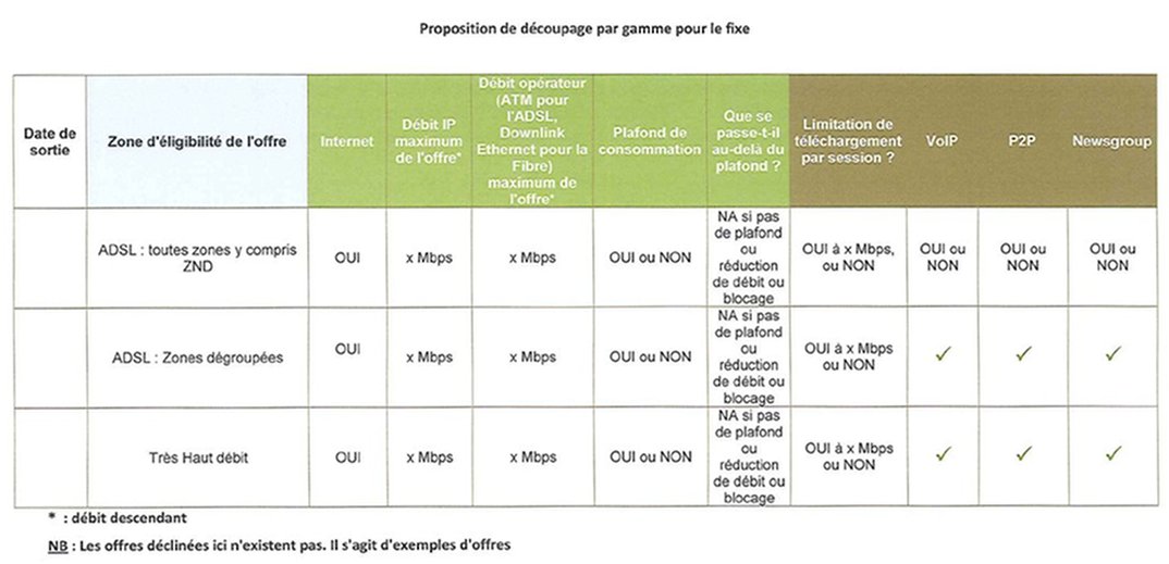 Selon lui, les plans de la Fédération Française des Télécoms (FFT – rassemblant les principaux opérateurs, Free et Numericable exclus) révélés par OWNI, ne valaient pas la peine d’être communiqués. Ils consistent pourtant à calquer les offres Internet mobile sur les forfaits fixes. A appliquer un tableau prévoyant de plafonner la navigation de salon, en excluant le peer-to-peer, la voix sur IP ou les newsgroup. Un détail, pas grand chose, tout juste la remise en cause du modèle français de l’Internet illimité. Pas de quoi tenir au courant les millions d’abonnés français.