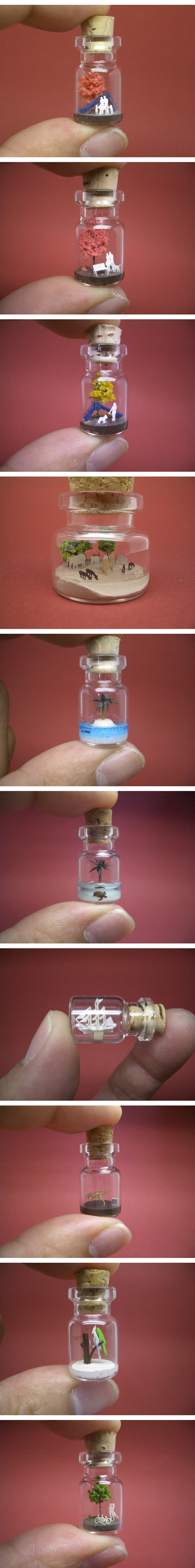 Je vous ai déjà présenté des oeuvres d’art miniatures, des petites conceptions graphiques ou encore des maquettes… mais avec ces miniatures là , c’est du jamais vu. Même si vous allez avoir besoin d’une loupe pour voir réellement ce que sont ces petits objets, ils sont faits pour vous surprendre. Chaque bouteille a un petit monde à l’intérieur, un petit monde féérique, imaginaire. Entre ce couple qui s’embrasse sous un arbre, ce dinosaure qui se promène, entre une tortue sur une île et cet arbre d’automne, voilà que l’on se met à imaginer des histoires.