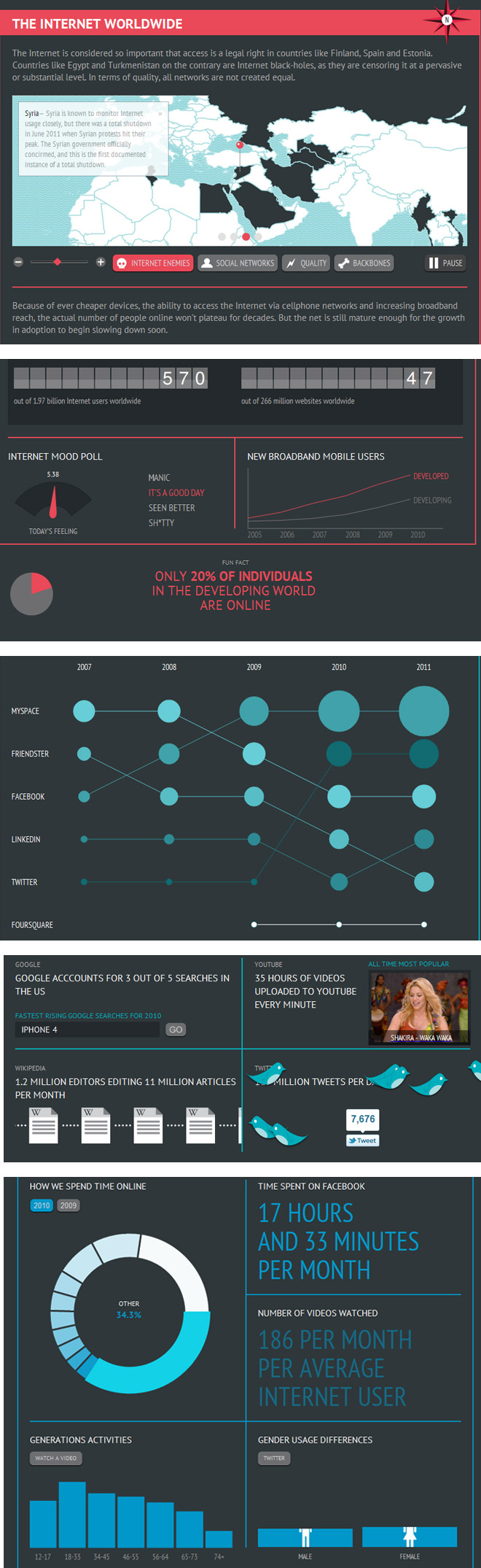 Allez, on continue notre revue de la semaine avec une visualisation de données interactive du plus bel acabit ! Souvent, le problème avec la visualisation de données, c’est qu’une fois l’image publiée, elle n’évolue pas et devient vite obsolète. Heureusement, la datavisualisation en “live” existe bel et bien et en voici un parfait exemple avec son penchant interactif beaucoup plus intéressant. Avec “The Internet Worldwide”, vous allez pouvoir visualiser en temps réel et en permanence les statistiques d’Internet. Par exemple, vous apercevrez combien de nouveaux sites web sont lancés toutes les minutes, quel est l’humeur d’Internet, quelles sont les recherches les plus fréquentes sur Google, etc. Bref, c’est impressionnant et tout ceci évolue sous vos yeux… !