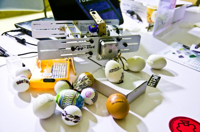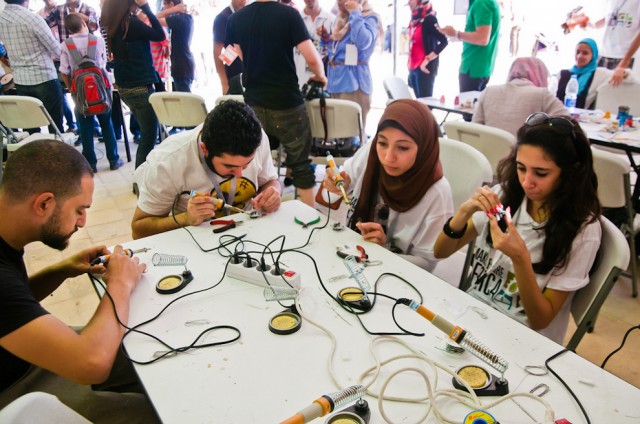« Nous sommes là pour partager notre longue expérience avec toute personne qui souhaite monter un hackerspace dans sa ville. Un grand bénéfice de la campagne Kickstarter a été de répandre l’appel. Avant MFA, nous avons organisé deux rencontres sur les hackerspaces, pour préparer les gens à monter et rejoindre un hackerspaces. Et il y en aura deux autres avant que nous partions. J’ai enseigné à environ 300 personnes à souder (moi-même) durant un atelier qui a duré trois jours, avec des kits et des fers à souder achetés avec l’argent des dons. Le nouveau hackerspace du Caire a assemblé la MakerBot, donnée par MakerBot Industries, ainsi que l’Egg-Bot, donnée par Evil Mad Scientist — et ils ont fait des ateliers d’impression 3D. Minal a donné des ateliers de fabric painting. Bilal a donné plusieurs ateliers Arduino avec des Arduino donnés par un nouveau magasin local d’électronique, Future-Electronics. »