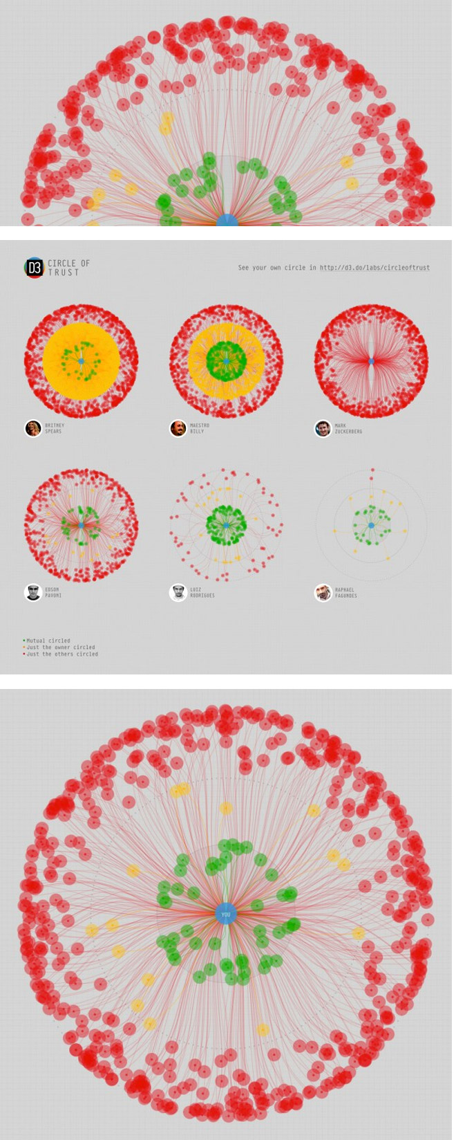 On continue avec de la visualisation de données interactive et en html5 ! Créée par D3 (une société de production numérique basée à Sao Paolo), le projet Circiel Of Trust se base sur Google Plus et vous montre graphiquement votre réseau de relations ! C’est un moyen intéressant de voir la façon dont chaque personne est reliée à nous et ainsi, construire un schéma visuel de ce drôle d’environnement social qu’est Google Plus.