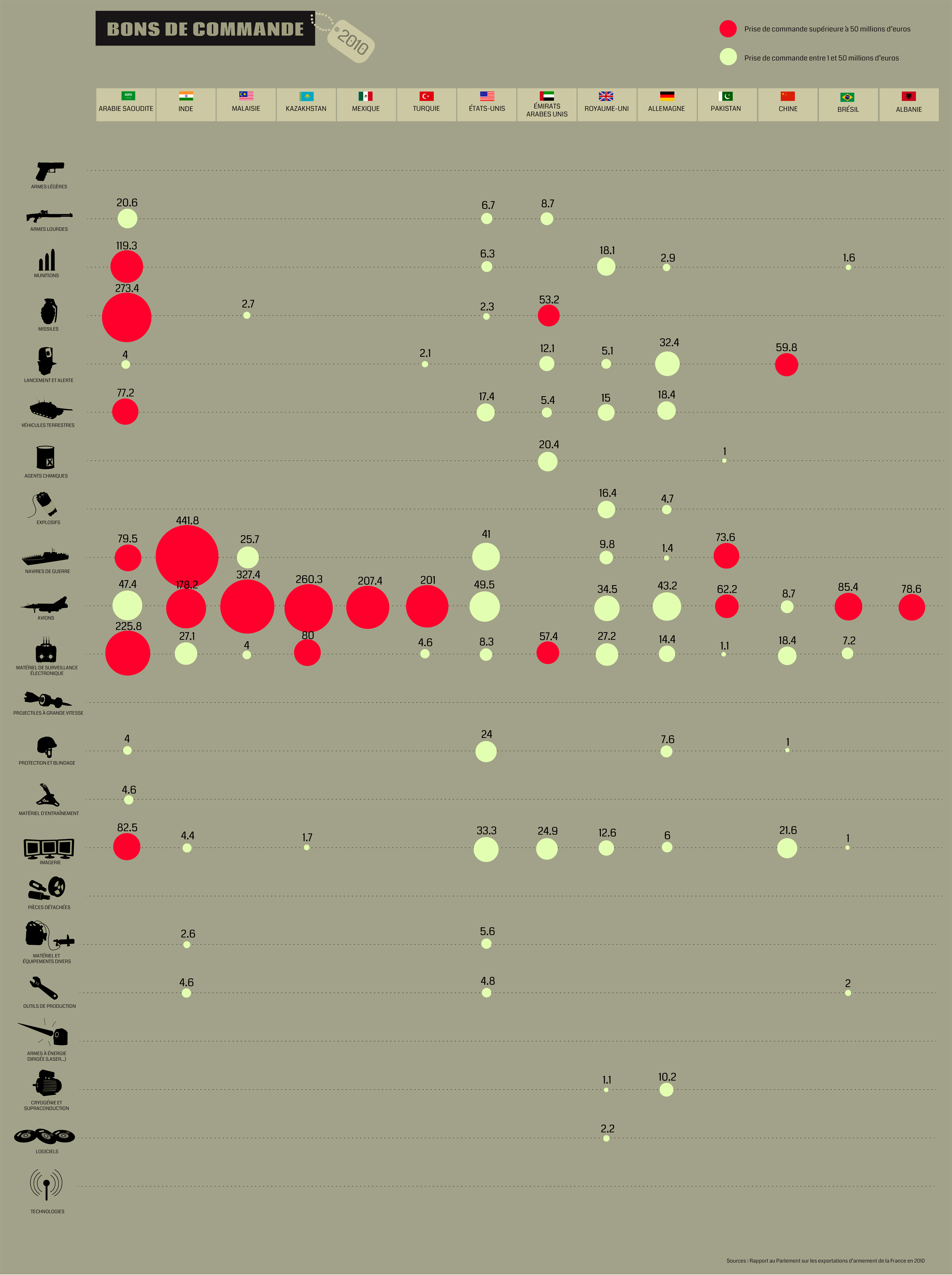 En 2009, elles plafonnaient à 8,1 milliards d’euros. Comme le montre notre visualisation, plusieurs importantes commandes ont été enregistrées en 2010, notamment avec l’Inde, la Malaisie, l’Arabie Saoudite et le Kazakhstan. Ils se concentrent dans les domaines aérien et supra-aérien, maritime, balistique, d’interception et brouillage des communications. (Cliquez sur l’image pour voir afficher l’ensemble des pays et des commandes).