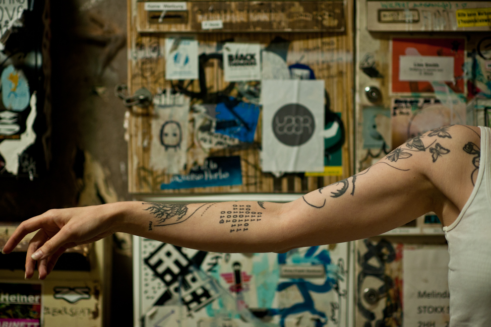 Cette adepte de la ligne de commande1, originaire d’Autriche, vit à Berlin, où nous l’avons rencontré. De ces jeunes gens qui font la richesse de la scène underground berlinoise. À Paris, son allure intriguerait, à Berlin c’est la norme, ou presque : mince corps couvert de tatouages – des souvenirs liés à des expériences difficiles – coupe de cheveux improbable – un mix brun-blond décoloré, qui commence en raton-laveur et finit en une abondante masse de cheveux – accent américain impeccable après plusieurs mois passés aux États-Unis. Et une énergie entretenue à coup de divers produits caféinés, comme le Club-Mate, la boisson préféré des hackers ou encore le Premium-Cola, une version du cola allemand Afri-Cola.