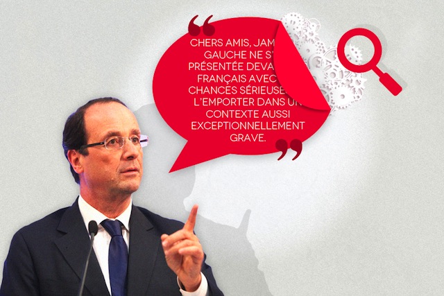 La foule réunie autour de François Hollande scande “François, président” et régulièrement le martèlera pendant plus d’une heure. Nous sommes le 22 octobre dernier, soir de la convention d’investiture de l’ancien premier secrétaire du Parti socialiste. François Hollande s’inspire du discours qui lui a été écrit, use sans abuser de digressions, d’ajout de verbiage et d’envolées lyriques. Le verbe lent, la phrase courte, il harangue les militants. Décryptage d’un long discours1.