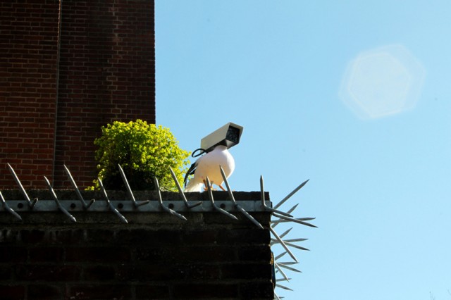 Deux artistes hollandais d’Utrecht traitent la vidéosurveillance comme la peste des villes et donnent aux caméras des corps de pigeon.