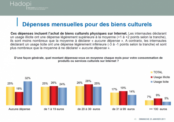 Bon d’accord c’est juste celle que les majors vendent sur iTunes et promeuvent sur Deezer et Spotify qui va mieux, mais on ne peut pas tout avoir, lutter contre le partage et favoriser la diversité culturelle. Vous pourriez bien sûr mentionner toutes les études, y compris celle de l’HADOPI (cf. image ci-dessus), qui montrent que les partageurs achètent plus, mais cela se saurait tout de même si quelque chose qui contredit à ce point les dogmes de l’économisme était vrai.
