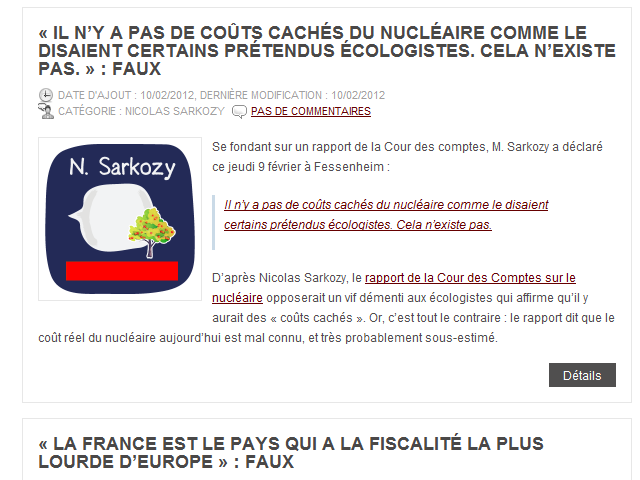 Autre exercice de “fact checking” réussi, dans une dimension beaucoup plus professionnelle, est la rubrique dédiée à la vérification des faits sur Vigie 2012. Cette initiative, dont l’un des artisans est également le patron du site d’actualités européennes EurActiv.fr, n’est pas des plus récentes et ne nécessite pas forcément qu’on en fasse la promotion ici.