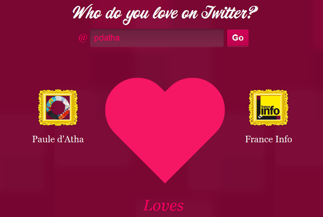 Primo, ne manquez pas l’indispensable compagnon du jour pour faire le joli coeur – et un(e) nouvel(le) ami(e) sur Twitter : Twitamore [en]. C’est absolument stupide, et absolument indispensable un 14 février.