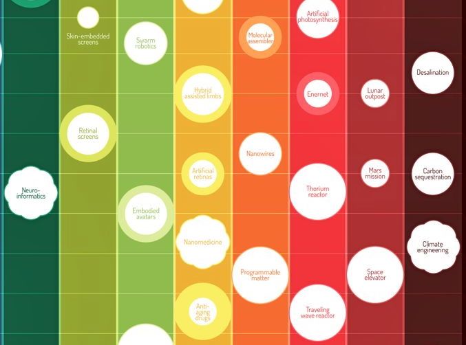“Envisioning technology” matérialise cette recherche : une frise chronologique, de 2010 à 2040, une infographie divisée en 11 bandes colorées, chacune représentant une catégorie de technologie évoquée par Michell Zalla: intelligence artificielle, robotique, Internet, énergies, biotechnologie,…