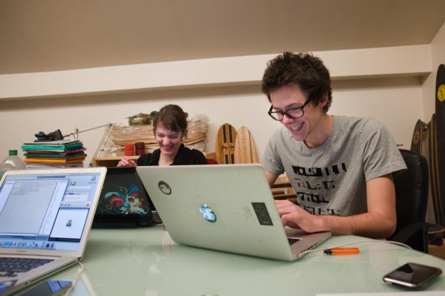 Amaëlle Guiton (Le Mouv) et Pierre Alonso (Owni) pendant la conférence de presse dans les locaux d'Owni via chat IRC le vendredi 24 février 2012