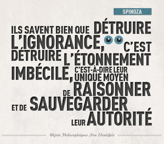Citation : « Ils savent bien que détruire l’ignorance, c’est détruire l’étonnement imbécile, c’est-à -dire leur unique moyen de raisonner et de sauvegarder leur autorité » - Spinoza