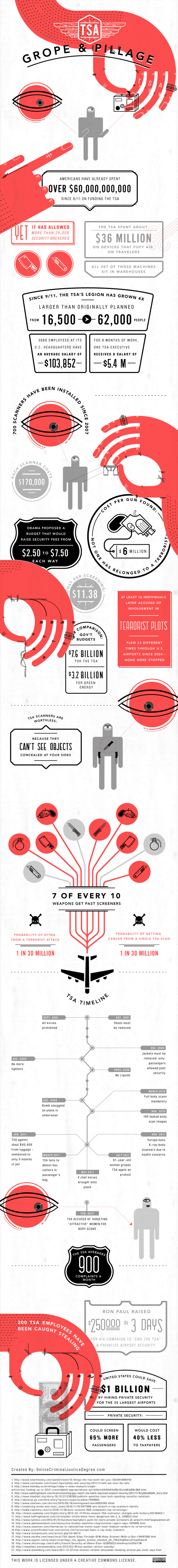 Bon, en général, je ne présente pas trop d’infographies en anglais, mais celle-ci m’a vraiment tapé dans l’oeil ! Publiée il y a quelques jours, voici quelques données et faits plutôt intéressants sur l’administration américaine des services de transport, j’ai nommé la TSA. Cette administration regroupe 50.000 agents de sécurité, inspecteurs, directeurs, gestionnaires aériens, etc. qui protègent les systèmes des Etats-Unis. Un métier chiffré donc, comme on l’aperçoit ci-dessous, avec un brin d’humour, de dérision et de beaux visuels.