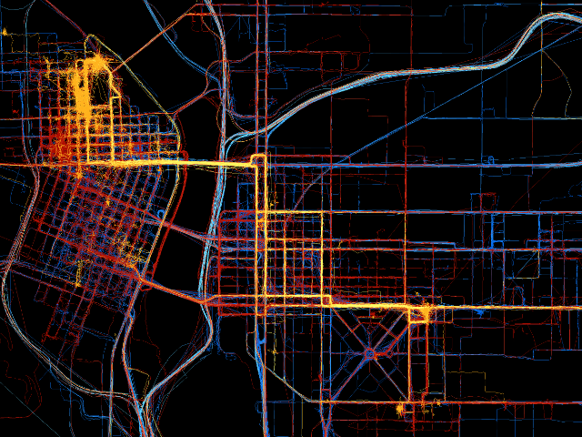 Autre lubie cartographique et cartographiée sur la côte ouest, c’est celle d’Aaron Parecki. Pourvu d’une balise GPS durant trois ans, il dévoile aujourd’hui sa passion pour la géographie en exhibant une série de cartes en couleurs qui ont la particularité de ne calquer son travail sur aucune trame physique existante. Les images proviennent uniquement des données fournies par le GPS, sans l’appui d’aucune carte, et les différentes couleurs suggèrent juste sa vitesse de déplacement – la largeur des traits mettant évidemment en valeur la fréquence des parcours usant des mêmes routes.