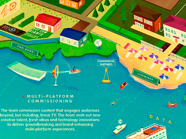Seconde bonne idée, c’est l’initiative de Channel 4 de dévoiler très différemment sa structure organisationnelle “chiante” en y rajoutant une histoire et de la couleur : “Infographic Turns Boring Corporate Workflow Into Buzzing Metropolis” accueille les nouveaux collaborateurs de la chaîne de télé anglaise et leur évite l’absurde succession de documents internes rébarbatifs, de présentations assomantes de la stratégie du groupe ou encore l’essentiel organigramme représentant l’armée mexicaine se trouvant au-dessus du nouvel arrivant. Idée plaisante qui tente d’humaniser un peu les ressources humaines.