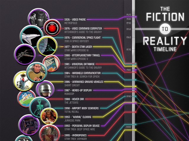 La première, Technology timeline (commanditaire : AT&T), est une frise chronologique permettant de comparer les objets de (science) fiction avec les objets de la réalité tels qu’ils ont été “inventés” plusieurs années après leur propulsion dans la littérature et/ou au cinéma. Entre le vidéophone de Métropolis (1926) et son succédané matériel apparaissant 80 années plus tard (Skype, 2006), ou les scanners corporels de Total Recall (1990) ou ceux pullulant dans nos aéroports depuis 2009, cette infographie fait ce qu’on lui dit de faire : elle informe et divertit.