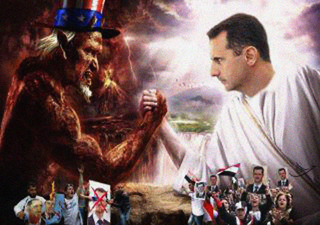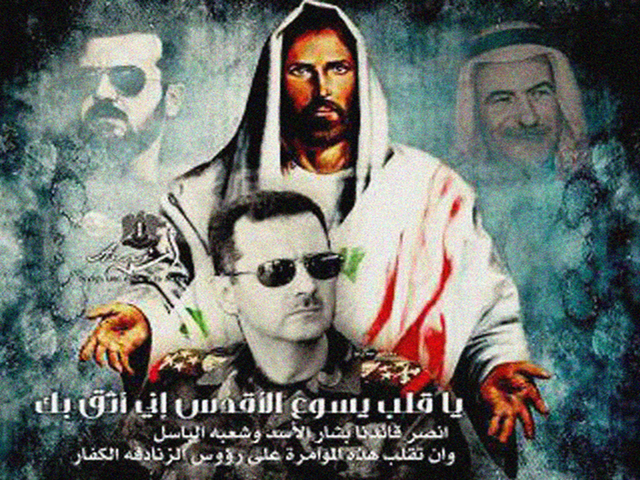 Depuis quelque temps, le régime s’adresse particulièrement aux minorités. Une image de propagande vise notamment les chrétiens : elle représente Jésus et Bachar al-Assad dans le même cadre et affiche la phrase suivante : “Jésus vous protège” ou “Jésus est à vos côtés”, et on voit que le poster essaye de faire peur aux chrétiens. Il y a énormément de minorités en Syrie, elles croient le discours du régime qui dit que le pays deviendra islamique si Bachar n’était plus là et ils se feraient tuer. Ce que fait le régime c’est qu’il vise chaque groupe et leur dit : “je suis avec vous, si je n’étais pas là vous mourrez, il y aurait une guerre civile, vous avez besoin de moi.” Il utilise donc des images de Dieu dans le ciel, des animaux comme l’aigle américain.