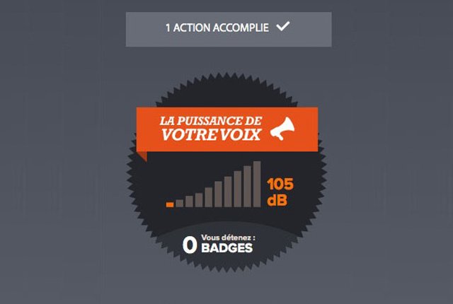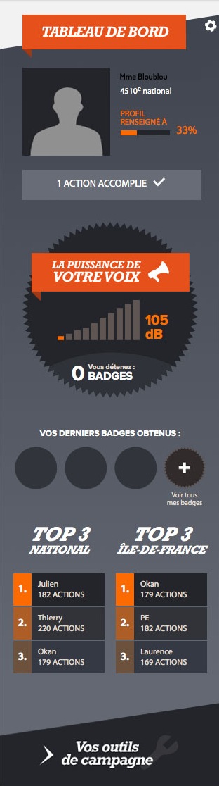 Développé avec les agences Spyrit et Big Youth l’espace “volontaires” du site du candidat utilise les principes de la gamification pour inciter les internautes à réaliser des missions pour faire connaître le parti et son programme. Régulièrement, les utilisateurs ou “Volontaires” reçoivent leur mission par mail. Distribuer des tracts de campagne ou envoyer un mail à ses contacts permet ainsi de gagner des points –des décibels-, convertibles en badges. À travers ces mécaniques, les équipes de campagne espéraient générer le plus de bruit possible autour du candidat grâce aux joueurs.