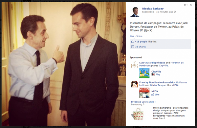 La distinction n’est pas aisée. Sur les sujets numériques, l’exercice a pris des allures de casse-tête. Pénalisation de la consultation des sites terroristes ? Sujet Président, nous informe son équipe. L’avenir d’Hadopi ? Sujet candidat avec des petits bouts de Président à l’intérieur. Et il y a plus subtil. Ainsi quand le fondateur de Twitter Jack Dorsey passe à Paris en mars dernier, il rend à la fois visite au chef de l’État et au candidat en campagne. Le site de l’Élysée s’occupant de relayer un communiqué officiel d’un côté, les communicants du candidat alimentant les comptes Facebook et Twitter dédiés à la campagne de l’autre. Quitte à s’emmêler les pinceaux en faisant campagne… au sein même du Palais présidentiel !