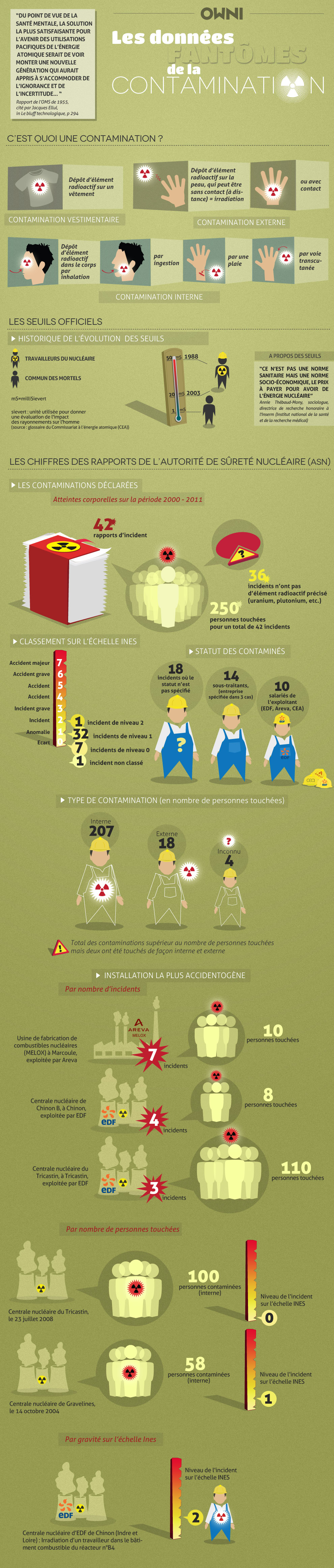 En une seule image, OWNI propose un état des lieux global des contaminations provoquées par les installations nucléaires françaises au cours des dix dernières années. La France, par tradition, dissimule ces données chiffrées. Derrière lesquelles tentent de vivre, ou survivre, les fantômes de la contamination. Sur OWNI, aujourd'hui, plusieurs articles sont consacrés à cette maladie honteuse, bien de chez nous.