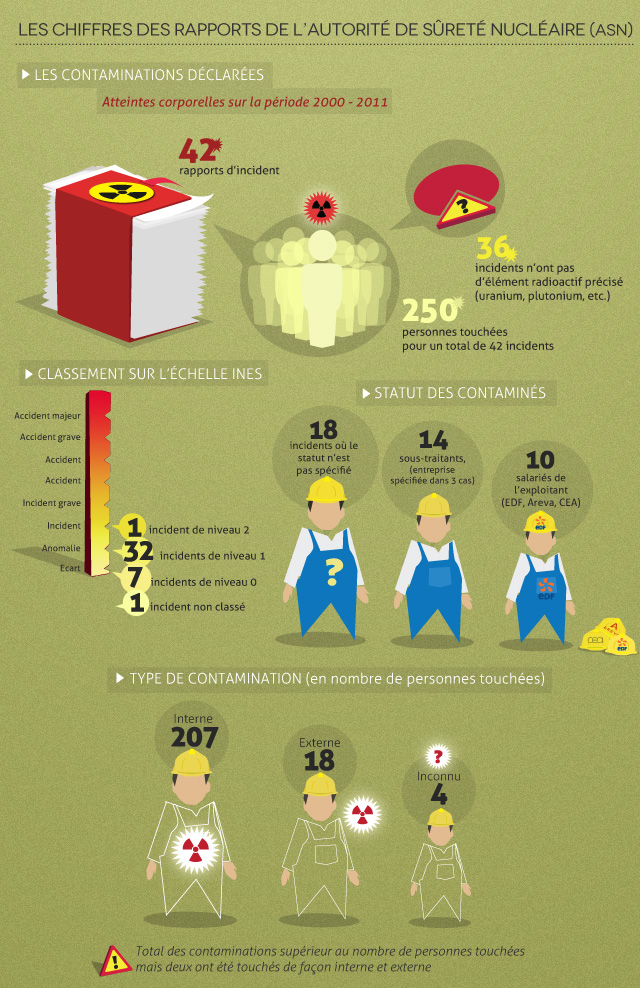 “Légère irradiation d’un expérimentateur”, “perte de protection biologique dans un local de travail”, “accident de niveau 1 sur une échelle qui en compte 7”. Si un profane survole les rapports de l’Autorité de sureté nucléaire (ASN), chargée du contrôle des installations nucléaires françaises, il ne s’inquiètera pas des contaminations touchant les salariés du secteur.