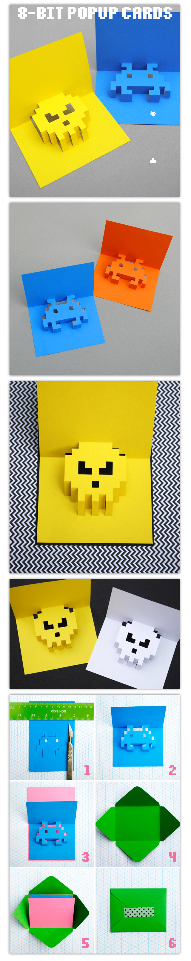 Cette semaine, on va se pencher sur un petit tutoriel qui est devenu très populaire sur le web : Comment réaliser un “Space Invaders Popup” et “Crâne en pixel en popup” ? Ce cartes sont vraiment minimalistes et très faciles à concevoir, une fois que vous avez le coup de main ;-). Il vous faudra donc vous armer d’un chouilla de patience, d’une pincée de papier, d’une once de cutter mais également d’une pointe comme une aiguille ou un compas ;-).