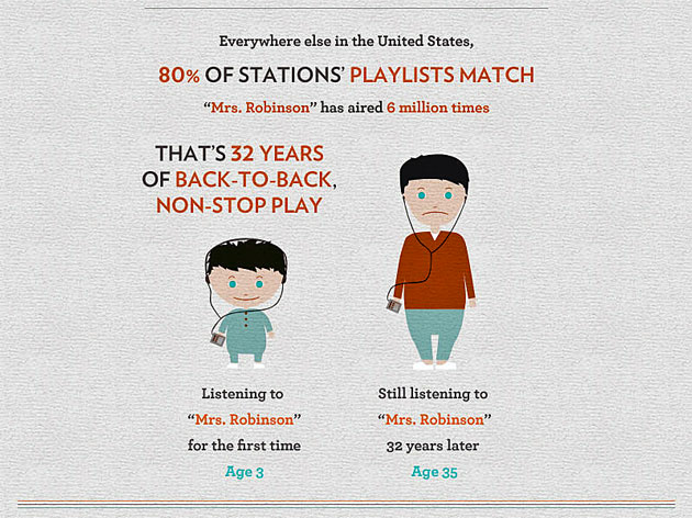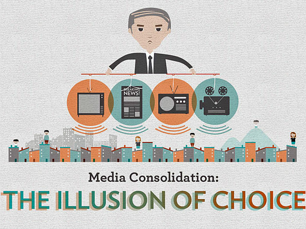 Où l’on y voit que la fusion de Comcast et NBC leur assure le contrôle de 20% des heures disponibles et le monopole de 11 marchés entiers dont New York et Chicago ; que 178 millions de personnes s’informent chaque mois avec des journaux appartenant à Time Warner ; que News Corp détient les plus gros journaux sur trois continents et ont “évité” de payer 875 millions de dollars en 2010 – ou encore que Clear Channel possède 1 200 stations de radio tandis que la loi lui interdit d’en posséder plus de 40, et que dans le Dakota du Nord elle possède même localement l’intégralité du réseau. Bref, une infographie qui est jolie et qui informe, et qui fait donc son boulot.