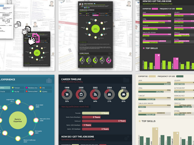 Dernière idée partagée cette semaine en matière de visualisation statique, celle du CV infographique. Le concept est au coeur d’une cogitation et d’une ferveur (ou inversement) depuis pas mal de temps, notamment avec une plate-forme comme Visualize.me. Ce précurseur se connecte à votre compte Linkedin pour vous pondre une représentation “épurée” (voire zen, hein) de votre parcours professionnel sous la forme d’une frise chronologique qui aurait avalé un mobile de Calder.
