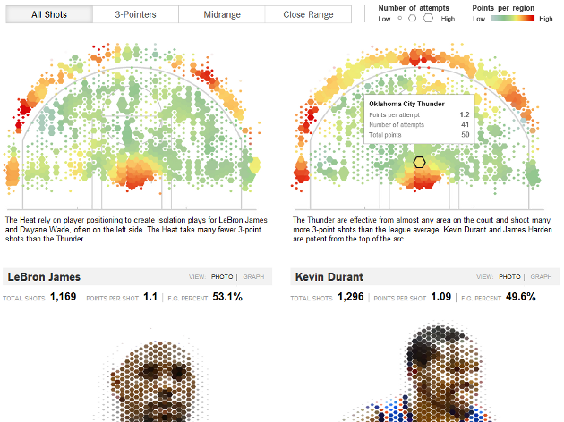 Le concept : démontrer grâce à un traitement de cartographie calorimétrique dans quelle zones du terrain les équipes finalistes de la NBA et leurs joueurs vedettes sont les plus dangeureux. C’est propre, c’est intelligent, c’est abordable aux profanes, c’est jQuery + CSS : c’est tout ce qu’on aime.
