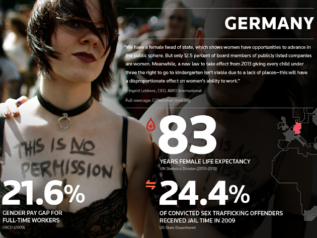 Le deuxième projet est l’oeuvre de Hyperakt pour la Fondation Thomson Reuters à l’occasion du G20. Après avoir pondu une série d’infographie l’an dernier afin de visualiser les cinq pays les plus dangereux de la planète, ce studio de design new-yorkais indépendant a remis le couvert avec les mêmes commanditaires pour mettre en lumière le “top 20 des meilleurs et des pires pays du G20 pour les femmes”.