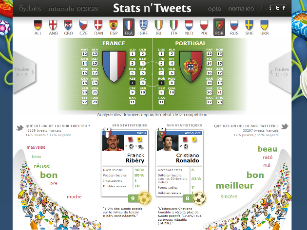 La première application est une version nettement améliorée (mais sans doute avec des moyens financiers très différents) de ce qu’Owni avait réalisé l’an dernier avec Eurosport autour du mercato de football. Cette année, une idée très semblable accompagne l’Euro2012 de l’UEFA : traquer le bruit généré sur Twitter par l’ensemble des joueurs participants à la compétition, une idée développée par la société Intactile Design avec l’aide de la technologie de Syllabs, une start-up française spécialisée dans l’analyse sémantique sur le web.