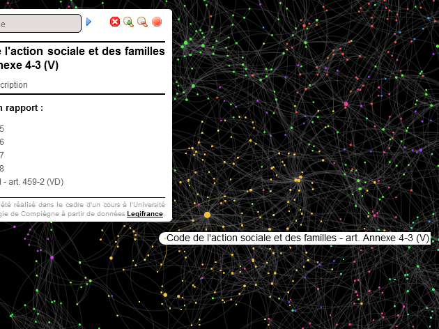 Quand on vous dit que la dataviz colonise tous les milieux… Même celui, particulièrement aride, de la législation française. Jacques Verrier, étudiant en informatique à l’Université de Technologie de Compiègne (UTC) a réalisé avec Gephi et sigmajs une datavisualisation du Code civil qui relie les articles se faisant référence, quelque soit le livre ou la section. Il explique sa méthode chez nos collègues de Data Publica.