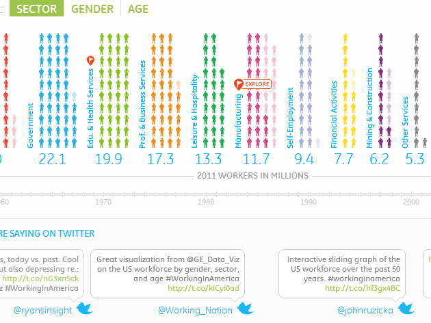 La plus réussie, sans conteste, est celle de General Electrics (GE) mettant en scène 50 ans de données sur l’emploi aux États-Unis.