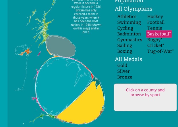 Cette carte des JO permet de visualiser l’origine des athlètes selon leur sport. Là où certains faits semblent évidents (les athlètes concourant pour la navigation à voile viennent plus souvent des régions côtières), d’autres moins connus sont mis en lumière : la prépondérance du sud comme origine des tennisman, le curieux équilibre nord/sud pour le basketball, écrasant toutes les régions.