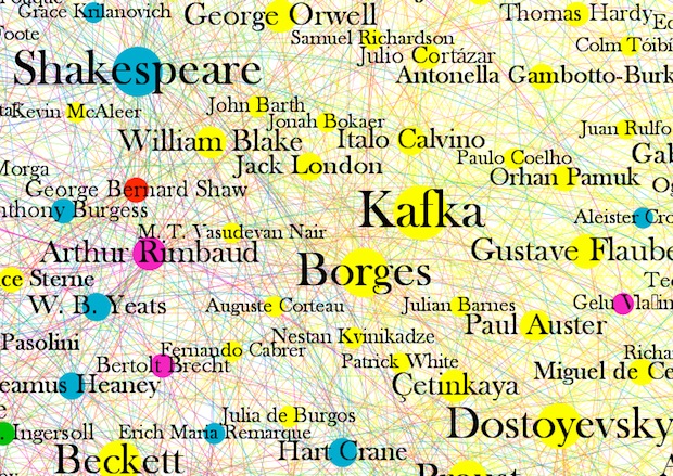 Sur ce graph, réalisé avec le logiciel de graphiques Gephi, la taille des nÅ“uds est proportionnelle au nombre de connections entre deux élements. Plus le nÅ“ud est important, plus grande est l’influence de cette personne. Nietzsche, Kant, Hegel, Hemingway, Shakespeare, Platon, Aristote et Kafka trustent sans surprise l’ensemble des liens. Cependant, d’autres connections méritent également le coup d’oeil : la forte influence des artistes comme Andy Warhol ou Marcel Duchamp par exemple.