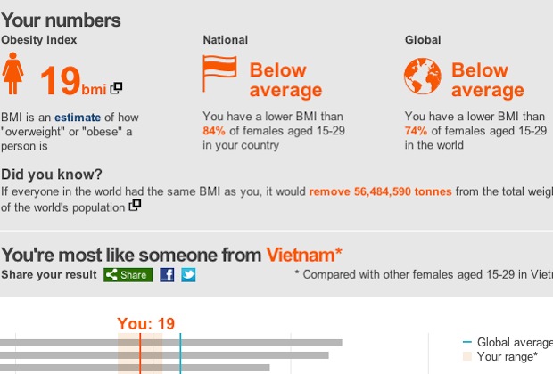 Où vous situez-vous sur l’échelle d’obésité mondiale ? C’est à cette étonnante question que la nouvelle application de la BBC vous propose une réponse. Après nous avoir permis de savoir combien de personnes vivaient sur la planète le jour de notre naissance ou encore d’évaluer l’étendue des pertes durant la seconde guerre mondiale en se basant sur nos amis facebook, la BBC poursuit dans sa série d’applications alliant graphiques, données mondiales et forte personnalisation.