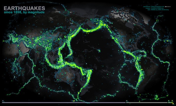 Une belle visualisation pour terminer cette chronique : celle de John Nelson sur les séismes dans le monde depuis 1898, représentés selon leur magnitude. John Nelson a utilisé les données de l’NCEDC (Nothern California Earthquake Data Center), USGS (US Geological Survey) et de l’Université de Berkeley, qu’il a replacé sur un des fonds de visualisations fournies par la Nasa. Outre l’esthétique permise par le fond de carte, les informations sur les zones les plus dangereuses ressortent clairement. John Nelson avait également représenté avec succès les incendies majeurs ayant frappé les Etats-Unis.