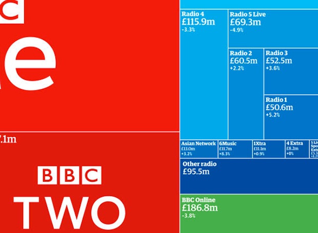 Après cette tasse de café, passons à des sujets plus sérieux. Par exemple, le financement des chaînes publiques par la redevance. Encore une belle illustration d’un travail sur l’open data à l’anglo-saxonne, qui nous est apporté par le Guardian. Dans son rapport annuel, la BBC détaille le budget et le financement de ses différentes chaînes et filiales. Le Guardian a isolé les financements issus de la redevance audiovisuelle pour représenter dans un tree map la répartition entre les chaînes du groupe, et l’évolution par rapport à l’année précédente. Le résultat est très lisible – BBC One et BBC Two restent les deux grandes gagnantes, mais avec l’évolution notable de CBBC (chaîne pour enfants).