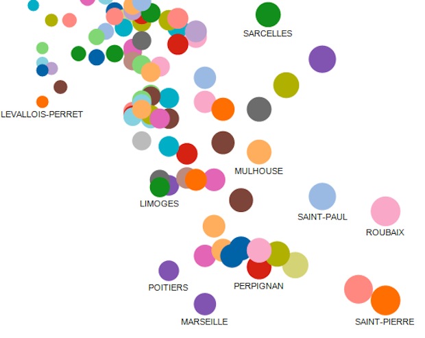 Ce taux correspond au pourcentage de ménages qui, dans une ville donnée, perçoivent moins de 60 % du revenu médian national après prestations et avant impôts (soit 954 euros). Sans surprise, en bas du classement, avec un taux aux alentours de 7 % se retrouvent à Versailles, Neuilly-sur-Seine, Rueil-Malmaison alors que Roubaix, Saint-Pierre, Tampon ou Saint-Paul (entre 39 et 46 % de taux de pauvreté) sont en tête. Réalisée avec Tableau public, l’infographie est parfois un peu lente à charger mais permet de visualiser d’un seul coup d’oeil les taux des 100 villes, et de comparer taux de pauvreté et revenu médian des ménages pauvres.
