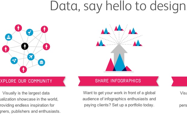Autre site intéressant, déjà bien connu pour qui suit un peu le monde de la data. Le site de référence Visual.ly s’est refondu pour devenir (ou du moins l’ambitionne-t-il) “le réseau social de la dataviz”, centré autour de trois axes principaux :