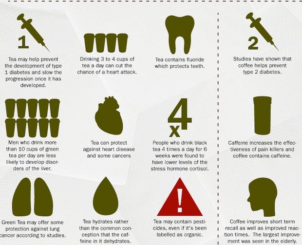 La quatrième “The Health Benefits of Coffee vs Tea” témoigne d’un travail plus riche, tant au niveau design que données. On y apprend par exemple que la vente annuelle de thé rapporte deux fois que celle du café, et les avantages/inconvénients de chaque breuvage : le thé contient du fluor qui protège les dents mais également du tanin, qui réduit les capacités d’absorption de fer de notre organisme, favorisant ainsi l’anémie. A l’inverse, le café aide à prévenir le diabète de type 2 mais réduit l’afflux du sang au cÅ“ur. Il en reste 18 à découvrir…