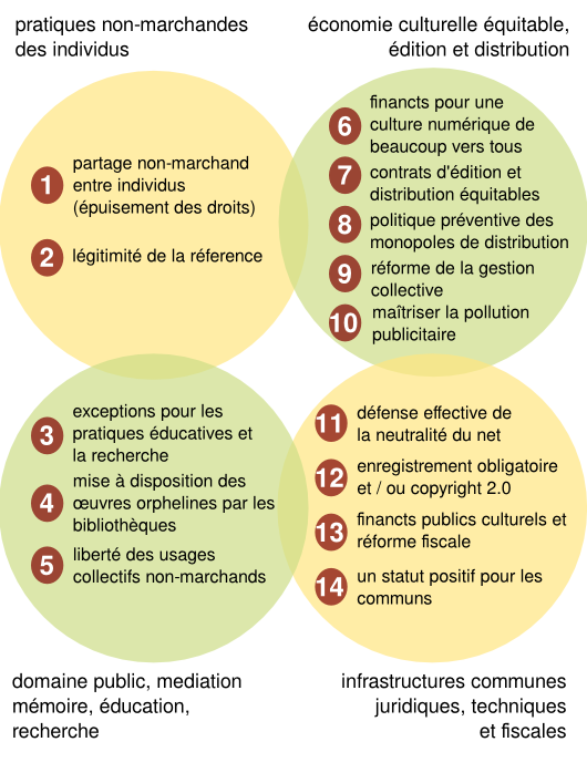 Articulé en 14 points représentés sur le schéma ci-dessous, ce texte couvre de nombreuses problématiques liées à la question de la création dans l’environnement numérique, aussi bien dans sa dimension juridique qu’économique et technique.