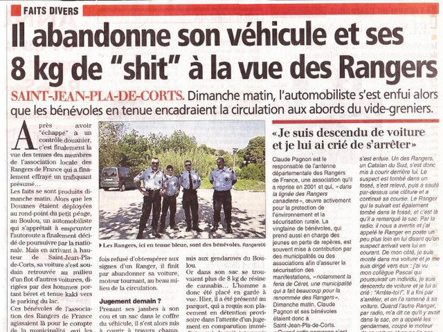 Un internaute commentait ainsi un article du journal régional de l’Aude et des Pyrénées-Orientales L’Indépendant intitulé “Il croit voir les gendarmes et abandonne 8 kilos de « shit » à la vue des Rangers”. Il relate comment un trafiquant présumé est passé à travers un contrôle douanier pour finalement s’enfuir devant des gens qu’il prend pour des forces de l’ordre assermentées et qui le coursent avec succès.